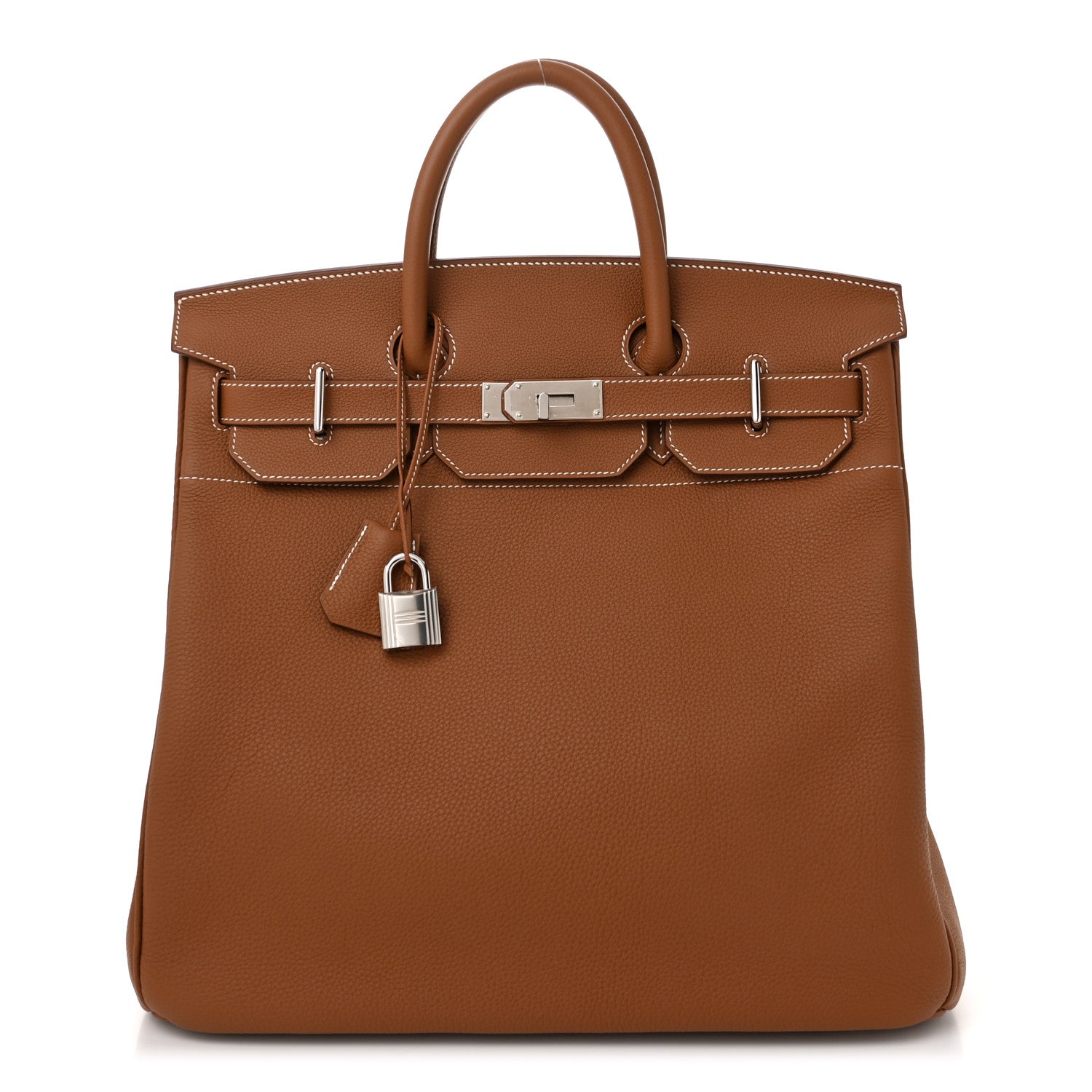This is an HERMES Togo HAC Birkin 40 in Gold. This spacious travel tote is crafted of fine togo calfskin leather in brown with expansive sides and a durable reinforced base. The bag features rolled leather top handles and a cross over flap with polished palladium plated tipped straps and turn lock closure with a padlock and keys as well as a leather covered key clochette. This opens to a brown matte chèvre goatskin leather interior.
