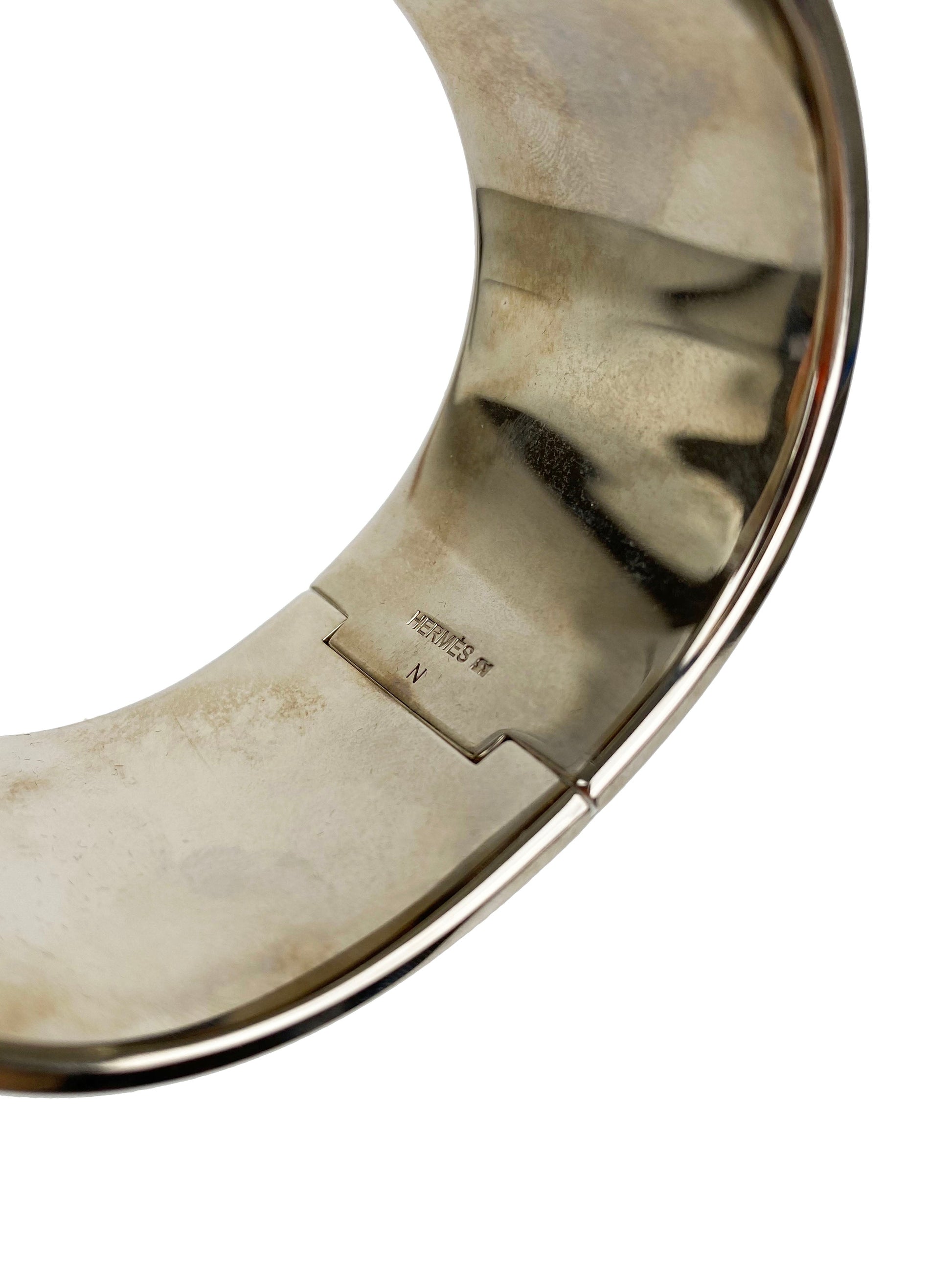 Description : Gorgeous statement bracelet by Hermes featuring soft pink outer and standout white 'H'. In excellent condition; mild oxidation/tarnish on inner.