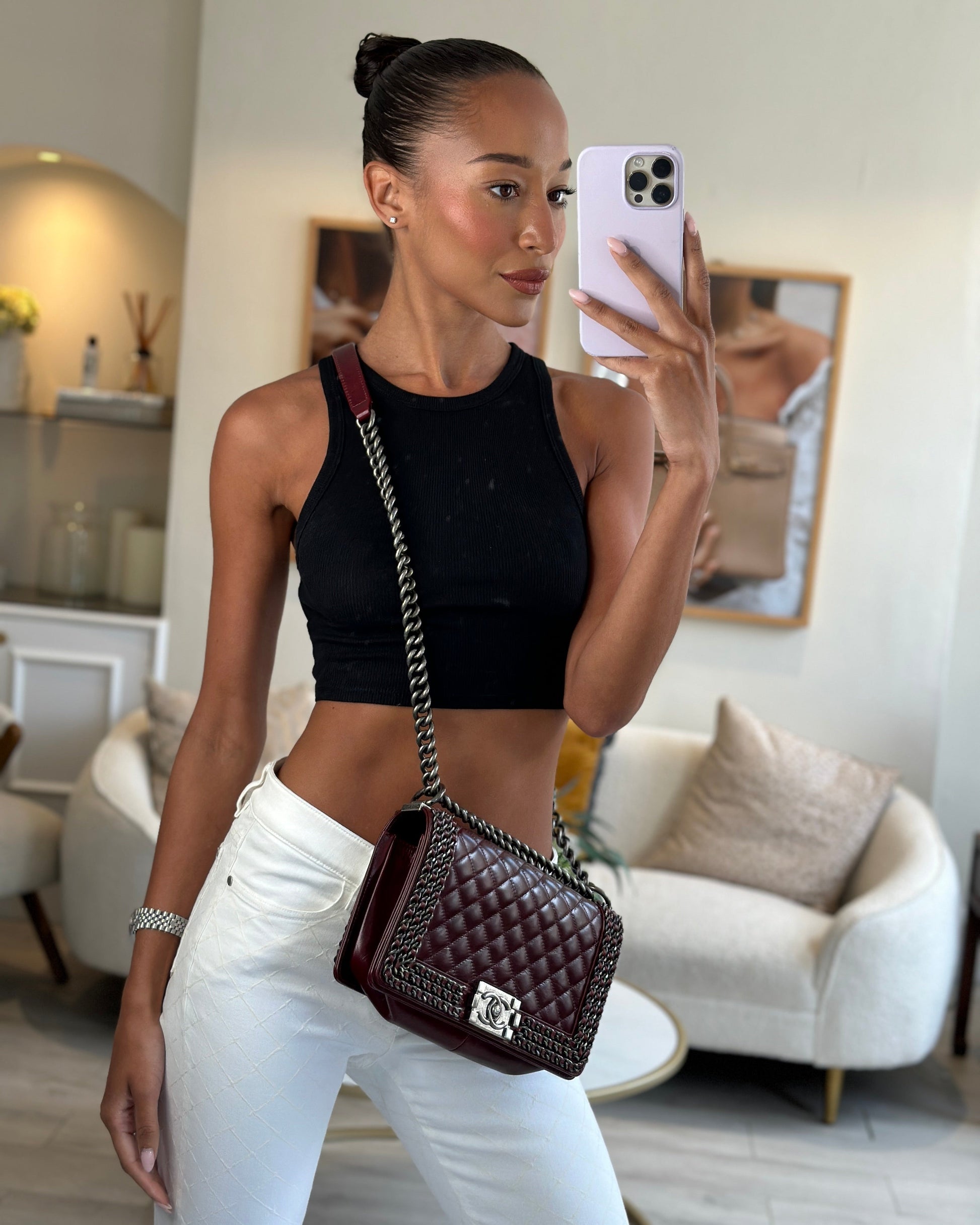 *HOT* Chanel Burgundy Medium Boy Bag in Shiny Aged Calfskin Leather with Ruthenium Hardware and Triple Chain Detail