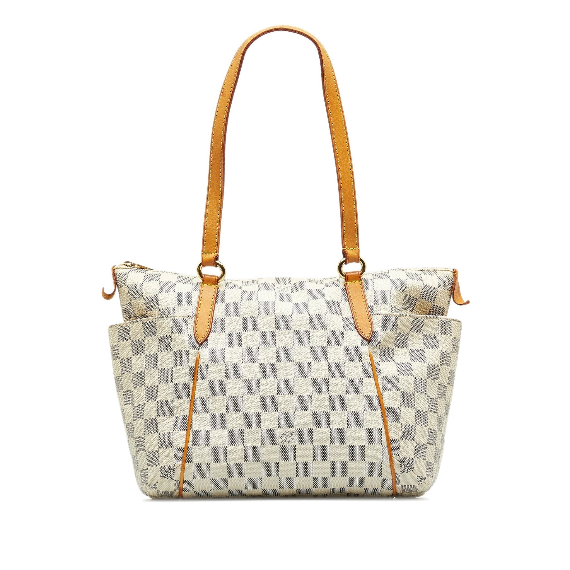 The Totally PM features a damier azur canvas body, flat leather handles, a top zip closure, exterior side slip pockets, and an interior slip pocket.