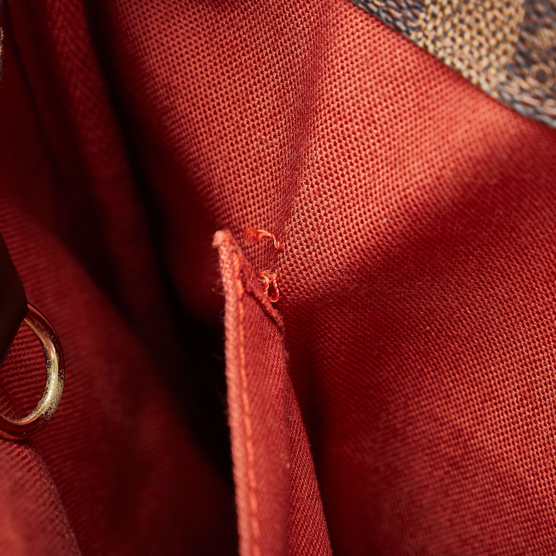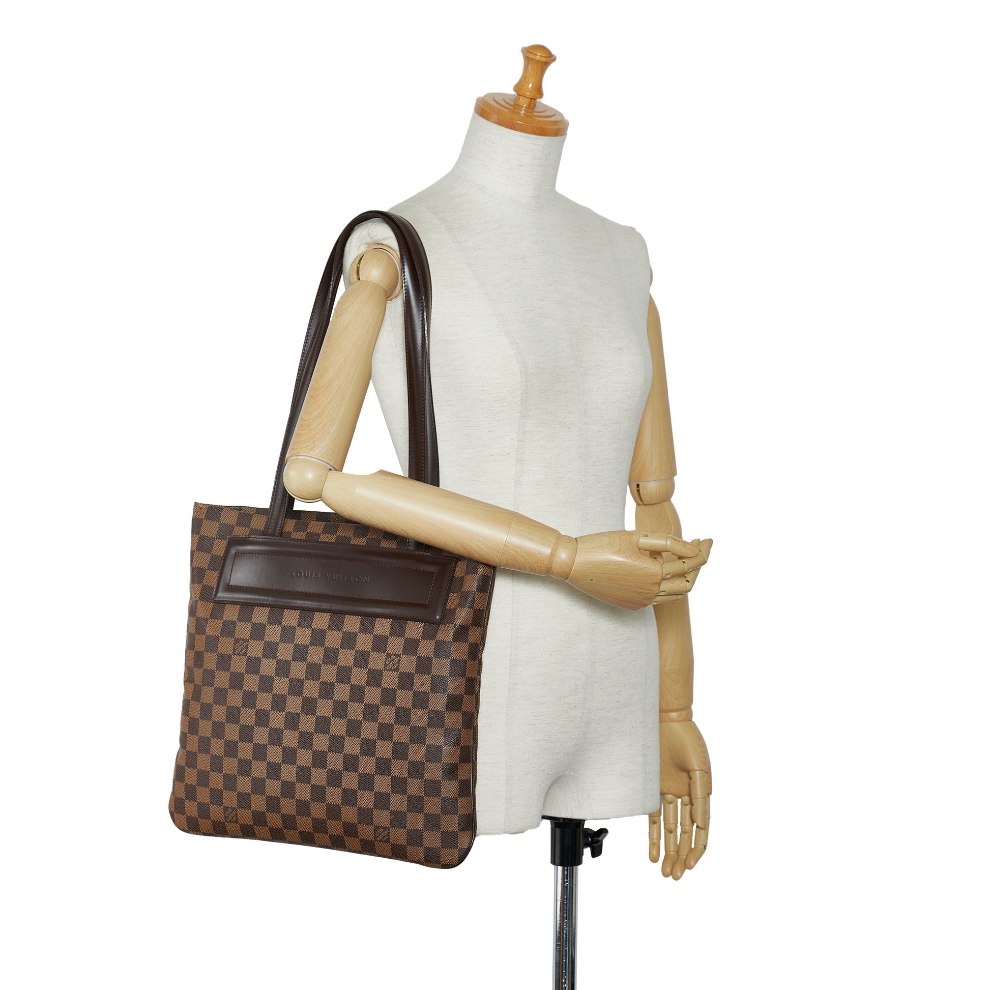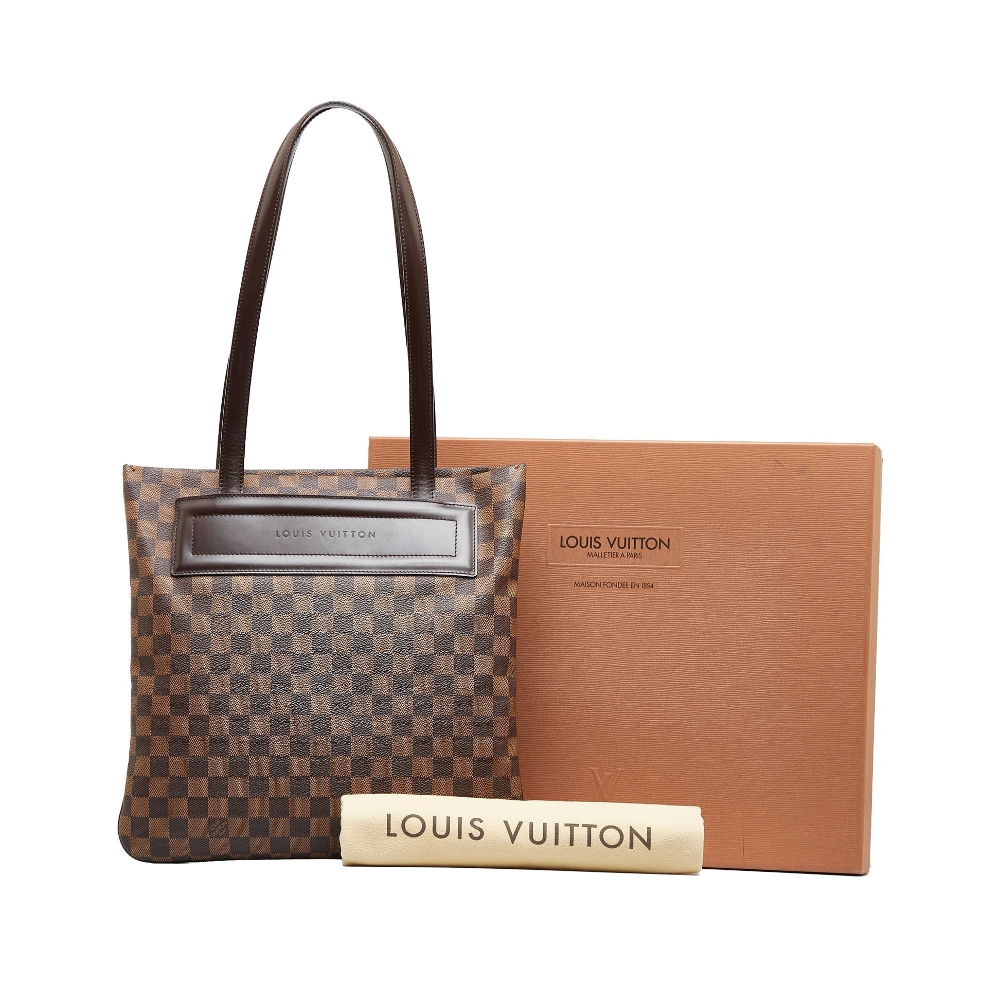This tote bag features a damier ebene canvas, flat leather straps, open top, and interior slip pockets. Comes with box and dust bag.
