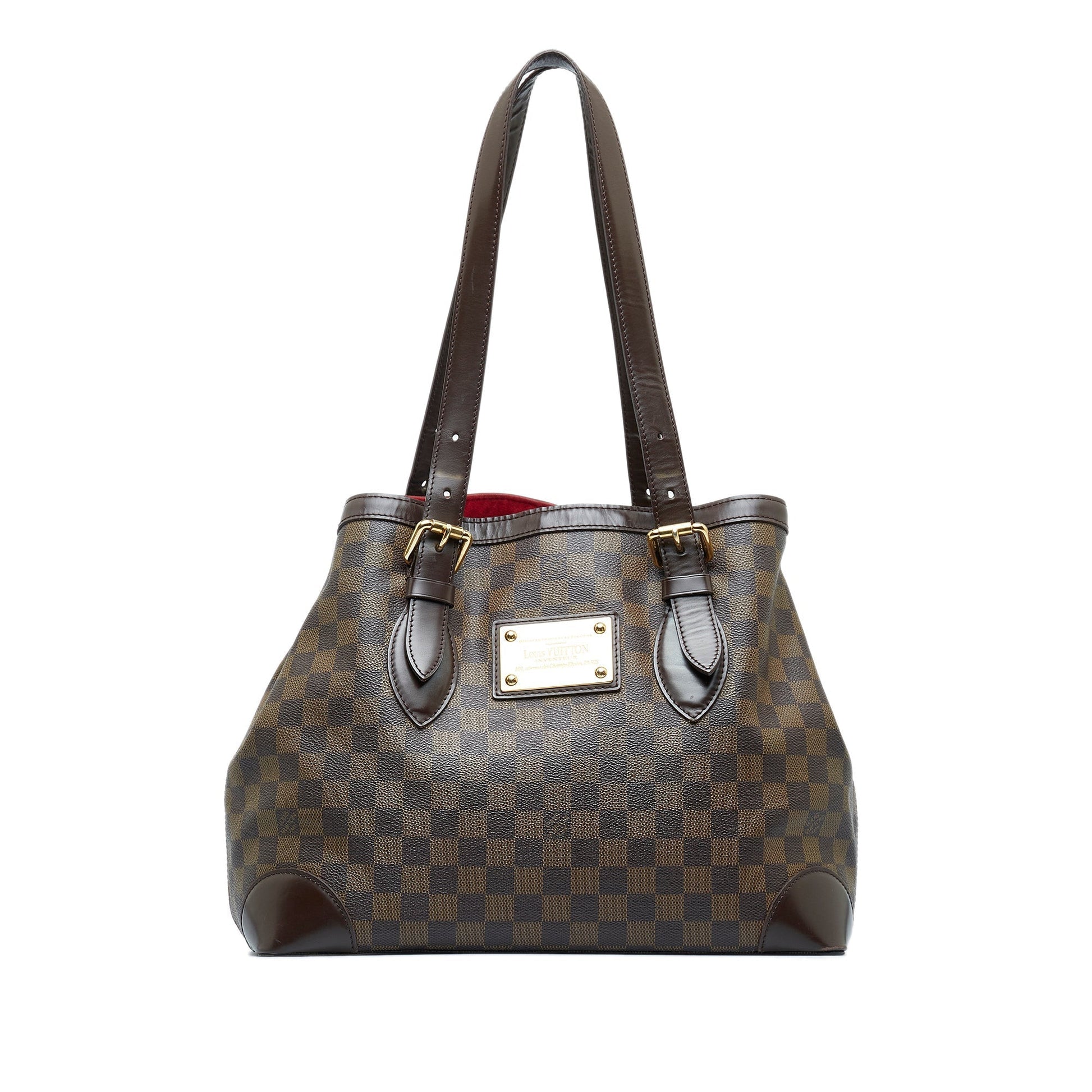 The Hampstead MM features a damier ebene canvas body, flat leather handles, an open top, and interior zip and slip pockets.