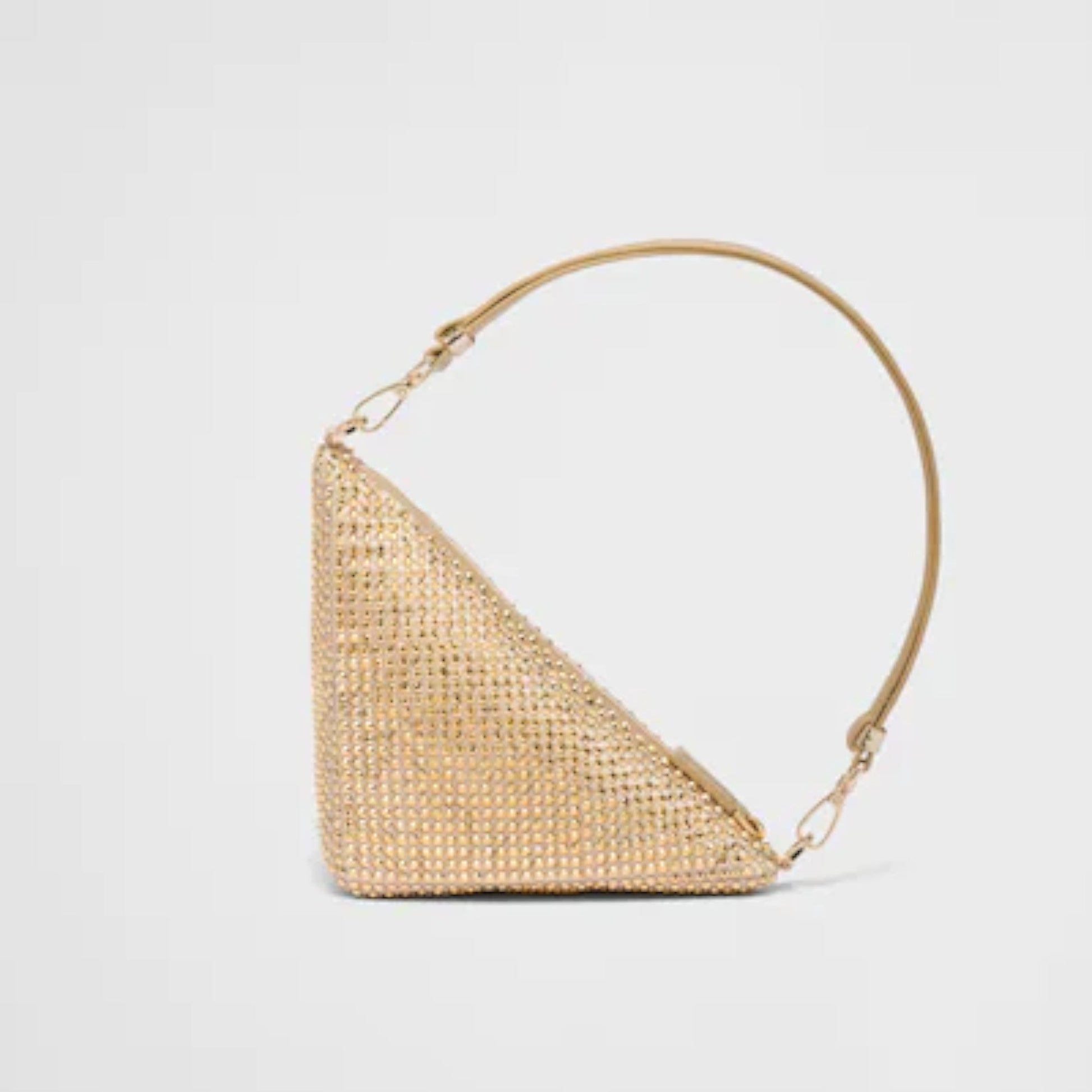 A study on the triangle inspires new geometric shapes and unique interpretations of Prada's historical code. The iconic shape is revived in this satin bag with sleek lines, entirely decorated with luminous crystals for a refined touch. The enameled metal triangle logo enhances the minimalist aesthetic.Fabric Product code:1BC190_2AWL_F0522_V_YOO