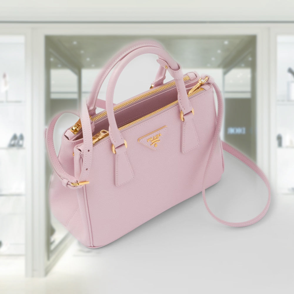 The Prada Galleria bag, which exemplifies Prada's centennial excellence in luxury leather goods, becomes a reflection of the brand's modernity and stylistic identity that seeks to interpret kaleidoscopic contemporaneity through a pragmatic design and structured lines. The accessory, presented in the small version, is made of iconic Saffiano leather that was patented by the founder of the brand and features a crosshatch texture and waxed finish. The Prada Galleria bag, named after the historic Prada store opened by Mario Prada in 1913 in Galleria Vittorio Emanuele II in Milan, expresses the quintessence of the brand's timeless elegance.