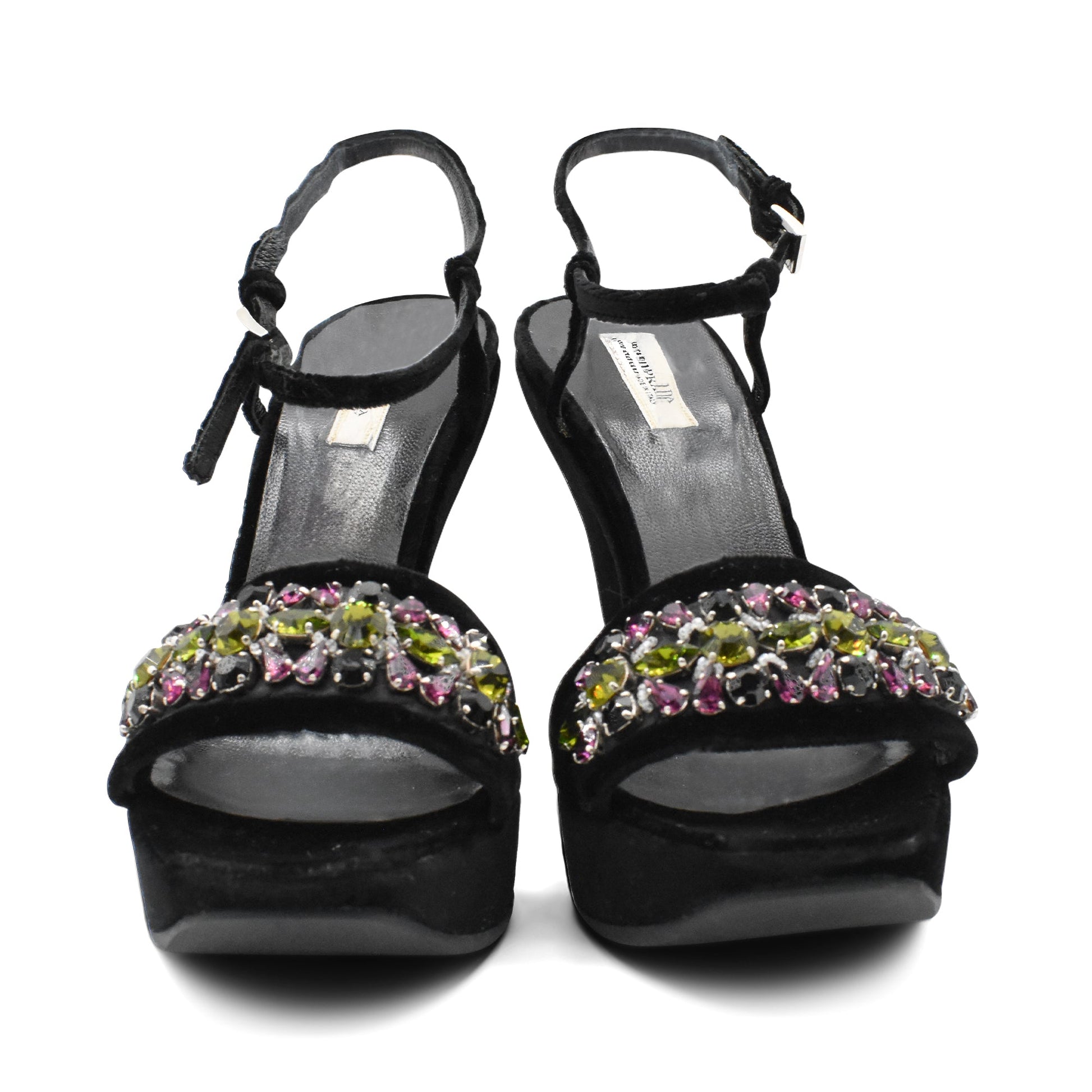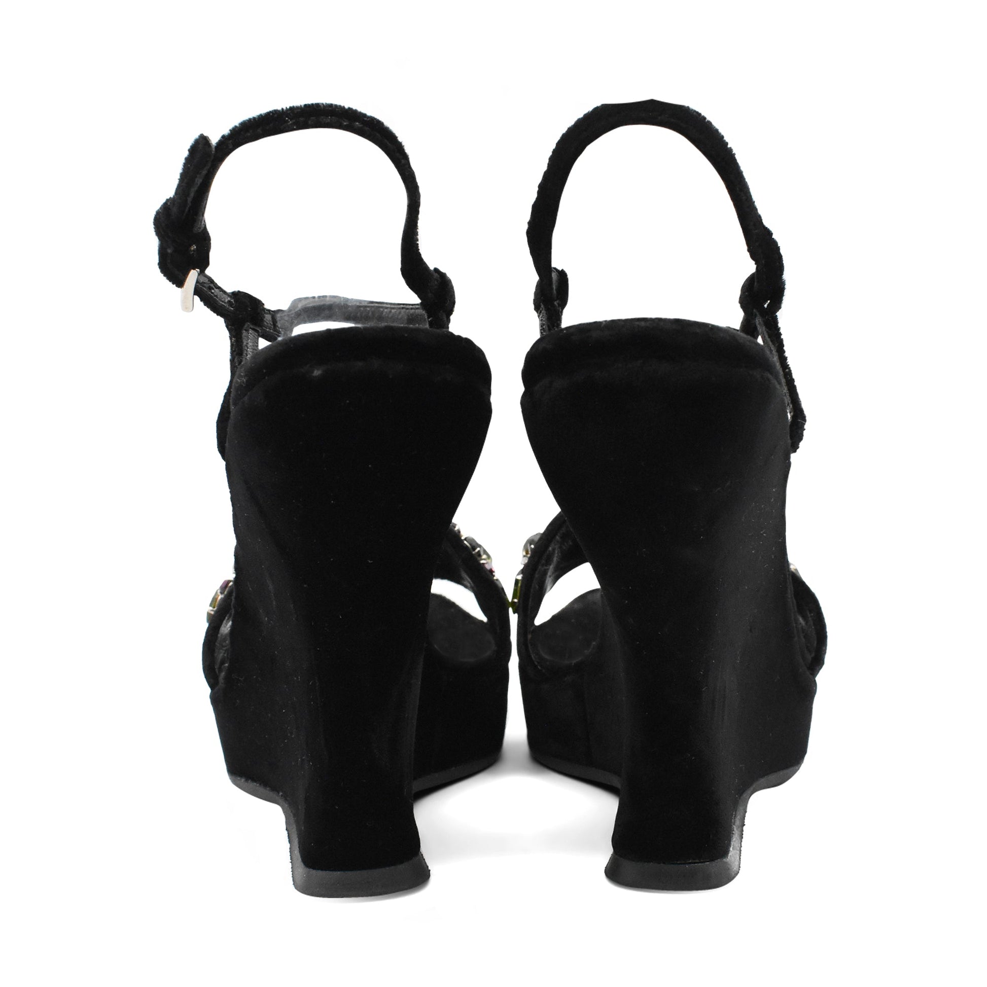 Prada wedges in black velvet with a curved heel, an ankle strap with silver buckle hardware, and purple, green and black gemstones along the toe strap.