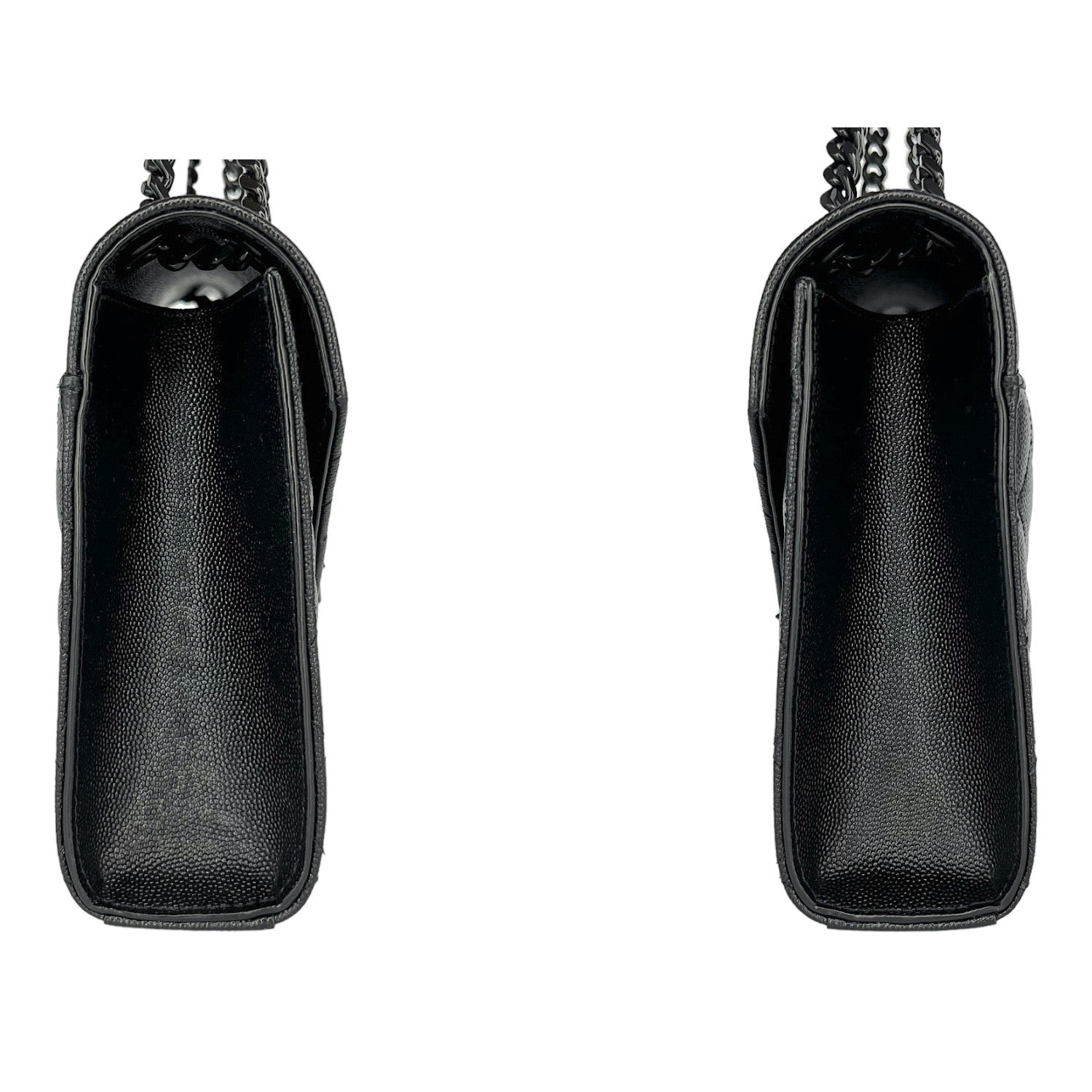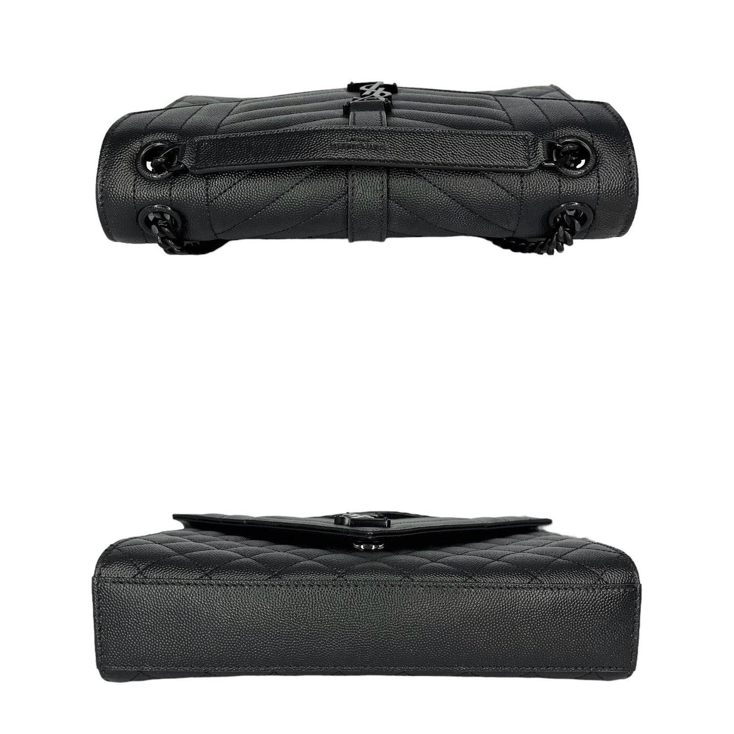 This Saint Laurent Medium Triquilt Envelope Bag was made in Italy and it is finely crafted of a black grained calfskin leather exterior with matte black hardware features. It has a slip pocket on the backside. It has a matte black chain-link shoulder strap. It has a fold over magnetic snap closure that opens up to a black twill interior with a slip pocket. This compact Bag is perfect for everyday and it is also by ! Retail $2,950.
