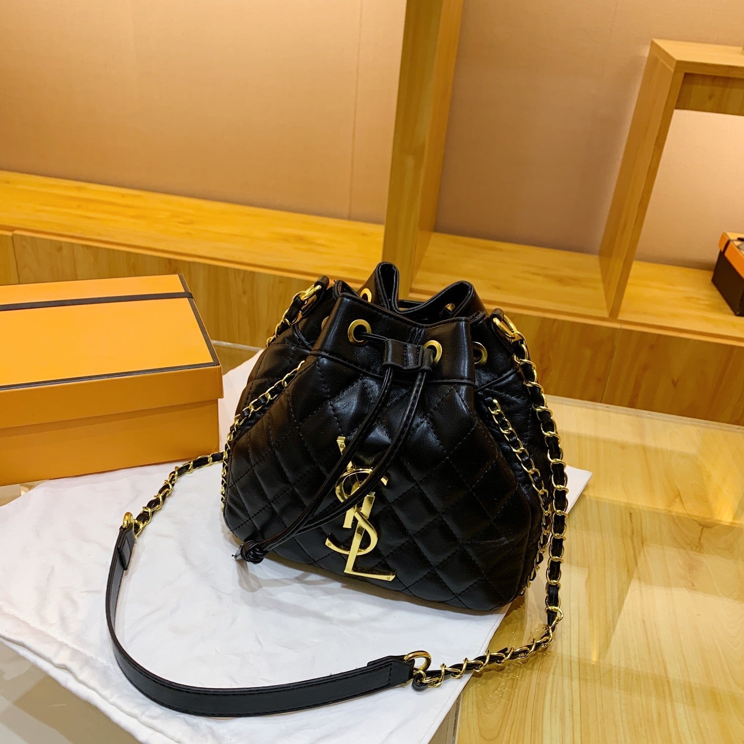 This product comes in a branded dust bag and paper bag only .No Branded box??
